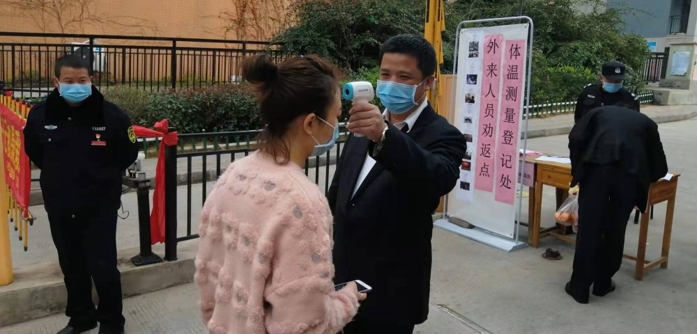 第一黨支部預(yù)備黨員,副董事長(zhǎng)陽(yáng)敏在陽(yáng)光金色春城小區(qū)對(duì)進(jìn)出人員進(jìn)行體溫測(cè)量